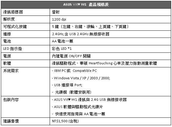 Asus Vit W1 心跳鼠規格