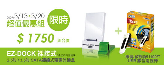 ICY DOCK與康博啟視錄攜手合作,自3月13號(本週五)至3月20號(下星期五) ,為期8天活動期間,絕對超值組合「裸接硬碟座」加「啟視錄電視棒」買一送一套餐專案,消費者凡購買ICY DOCK MB881US-1S-1裸接式硬碟外接盒 及 康博啟視錄U100/T數位電視棒一只,即可享有絕對超值優惠價,一箭雙鵰,活動加碼不手軟,趕緊把握機會,要搶要快!