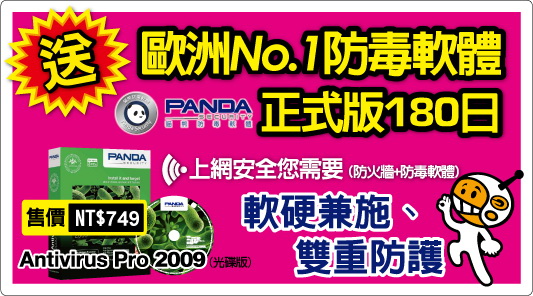即日起,消費者只要在全省3C門市或線上購買corega寬頻分享器,認明包裝上專案促銷貼紙,將可免費獲得市價749元的Panda Antivirus Pro 2009 180日正式授權防毒軟體,於2010年3月底前開通都有效,詳情請至官網查詢,或電洽客服專線。