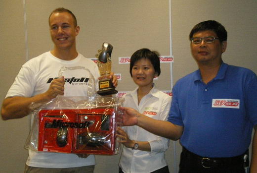 身為微軟IE3.0的全球知名愛用者,HeatoN更大力推薦自己的戰鬥配備:「微軟的IE3.0滑鼠具備了極佳的靈敏度與反應度,是我在全球四處征戰時最滿意的愛將!而今天試玩的微軟遊戲周邊系列,不管是讓我驚豔、操作更方便的SideWinder X6可拆卸組合數字鍵盤,還是SideWinder X8創新的BlueTrackTM感應技術,讓滑鼠在使用上反應更加靈敏,還有我最喜歡的IE3.0也有的微軟滑鼠舒適曲線的貼心設計,都讓我更加相信微軟遊戲滑鼠鍵盤是遊戲玩家的第一首選!」為了感謝HeatoN對微軟遊戲周邊的支持,台灣微軟娛樂暨裝置事業處副總經理周文英更特別贈送象徵電競界第一高手的「微軟遊戲滑鼠黃金琉璃手」,作為HeatoN來台難忘的紀念品。