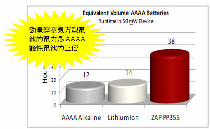 – 在相同的電池體積條件下可延伸高達3倍的使用時間 - 相較於體積最小的鹼性AAAA電池8 mm直徑,其厚度僅5mm的輕薄規格