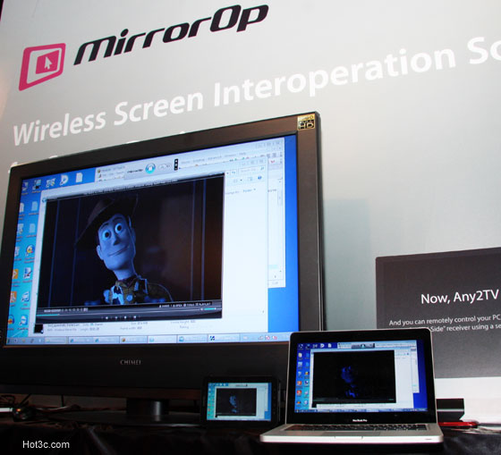MirrorOP 是個相當特別的產品,可以將 iPhone、Android 手機上的畫面,透過 WiFi 同步傳送到數位電視或電腦上,省卻了 HDMI或 AV連線的麻煩,便可即時無線傳輸這些畫面。使用在數位電視時,必須透過轉接盒接收 WiFi 訊號然後再利用 HDMI輸出到 DTV上: