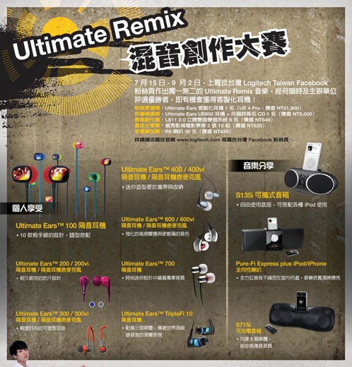 想跟DJ一樣耍酷、即興Remix音樂?蠢蠢欲動的音樂細胞無處宣洩?秀一手的好機會來了!為讓熱愛音樂創作的音樂迷有更多元的創作平台,深受世界頂級巡迴音樂人愛用的Ultimate Ears,即日起於羅技台灣Logitech台灣粉絲頁,推出“Ultimate Remix混音創作大賽”!即日起於9/2止前往羅技Facebook活動頁面,可透過個人音樂創意的發揮、隨意組合指尖跳躍的音符,展現獨一無二的音樂魅力!獲勝者即可贏得Ultimate Ears客製化耳機以及金曲入圍歌手何韻詩簽名CD等48項豐富超值大獎!活動期間內,凡選購指定款Ultimate Ears耳機,更可免費體驗KKBox線上音樂30天!Ultimate Ears廣邀各界音樂高手挑戰音符Remix的無限可能,隨時享受音樂的無限樂趣!