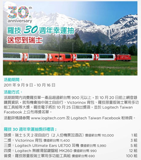 “羅技30週年幸運抽‧送您到瑞士” 抽獎活動: