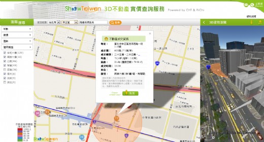 不動產實價登錄自101年8月上路以來,一直受到民眾的關注,為增進民眾對查詢的不動產物件有充分認識並正確評估,中華電信率先推出有感的3D不動產實價查詢服務,運用ShowTaiwan 3D地圖平台的3D視覺瀏覽查詢功能,讓民眾可以依縣市、區域、成交價格等條件來查詢不動產各物件的交易實價、每坪單價、屋齡、樓別、交易年月等相關資訊,並且在3D立體地圖上觀看建物的基本3D虛擬模型,以及鄰近建物的相對位置、樓高、棟距、路寬、坡地等,還可查看周邊的道路資訊,讓民眾輕鬆選好房,快樂遷新居。