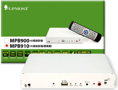 『UPMOST MPB910 HD錄放影機 (專業版)』,是一款可單機操作的錄放影機,提供HDMI、色差及CVBS影音輸入端子,採用全新AVCHD/H.264(M2TS)硬體編碼格式,將影音訊號即時壓縮後,儲存到USB外接裝置(高速隨身碟或外接式硬碟)上,HDMI提供Bypass即時輸出端子,無延遲即時預覽HDMI來源訊號,同時提供相對應的影音輸出端子,操作回放錄製完成的檔案。透過紅外線遙控器或前置面板單鍵錄影按鈕,一鍵即錄,簡化操作步驟使用更容易,錄製完成的檔案可以在本機直接播放,或於多媒體播放器、藍光播放機及電腦上觀看。