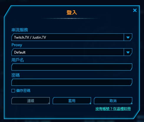 如果要進行串流直播則必須輸入 Twitch.TV/Justin.TV 的帳戶密碼: