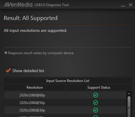 透過 AVerMedia 獨家的 USB 3.0診斷工具,可測試用戶電腦 USB3.0 效能是否具有足夠頻寬來傳輸 1080p 60fps 影音內容。萬一頻寬不足時,還可用此工具直接調整影像畫面更新率。