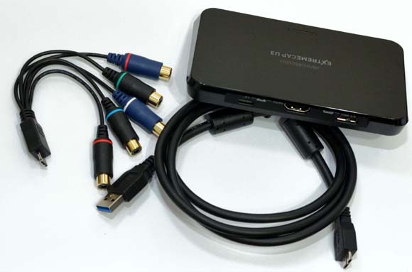Extremecap U3 就是利用 USB 3.0 將影音訊號輸出給電腦,因此該處標示了 OUT 字樣。在輸入端 (IN) 部分,除了 HDMI 外,還可透過附屬的專用色差端子連接線接到相關週邊。在配件中也包括了 USB 3.0 連接線以及色差線材,但並不提供 HDMI 線材: