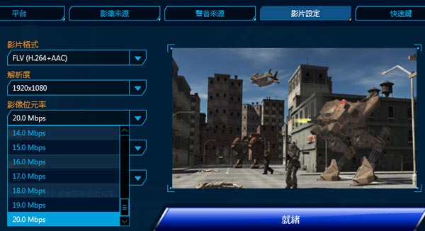 設定畫面中,可針對錄影解析度、位元率、聲音、畫面更新率等參數進行設定: