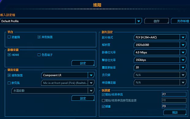 可看到最高解析度可達 1920x1080,位元率可達 60Mbps,畫面更新率也可達 60fps。錄製的格式則為 H.264+AAC的 FLV 檔案。也可以加裝外接麥克風收音錄製,此時聲音會另外以 MP3 檔案儲存以方便未來的處理: