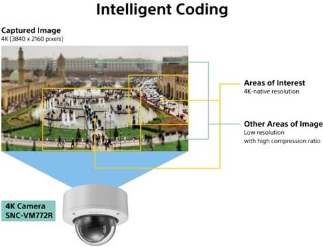 SNC-VM772R監視攝影機擁有Sony獨家頻寬優化技術,使用者可依需求調整播放以及操作設定;使用Sony全新的智慧編碼功能可針對特殊區域,採用不同壓縮方式減少儲存及頻寬消耗;全新的智慧裁切功能(Intelligent Coding)及“多目標跟蹤功能”(Multi-Tracking)可以最多顯示特定區域,用戶可以選擇特定區域使用4K解析度觀看,同時影像的串流仍可以用HD 畫質的流量傳輸。 由於可選擇特定的區域觀看4K解析度,總體的傳輸量少,使頻寬消耗率降低了約50%,因此能提供更有效率、更具符合特定需求的監控方式。