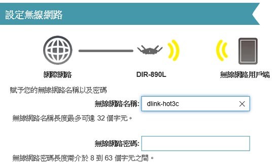 用戶可自行設定 SSID(無線網路名稱)、密碼(至少要八個字元):
