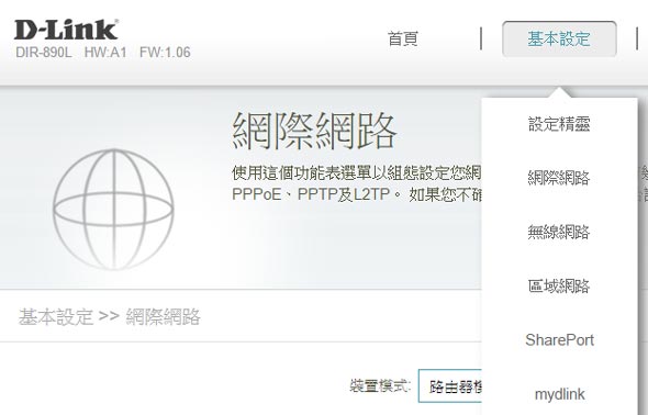除了上述的安裝精靈外,DIR-890L 當然還有更多設定選單。在基本設定中,可針對 Internet, WiFi, LAN, SharePort 等進行設定: