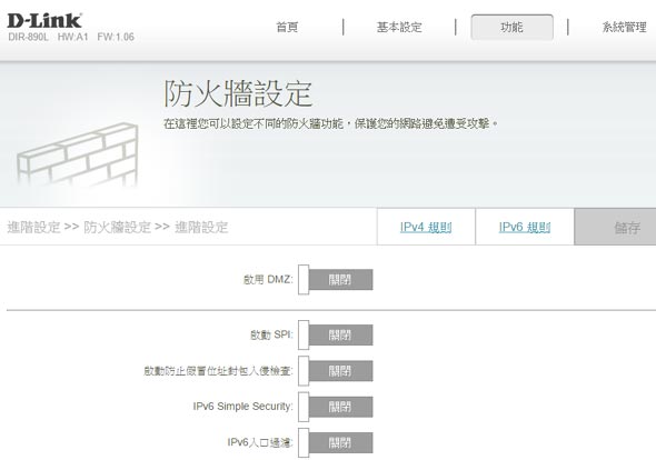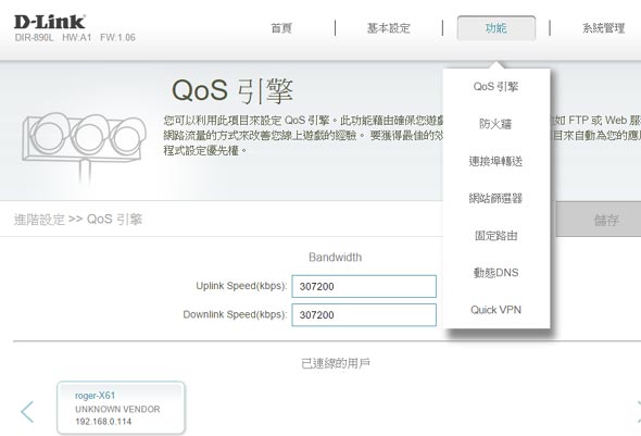 在功能選單中,可設定 QoS, 防火牆, 網站篩選, 固定路由, 動態 DNS, VPN 等等: