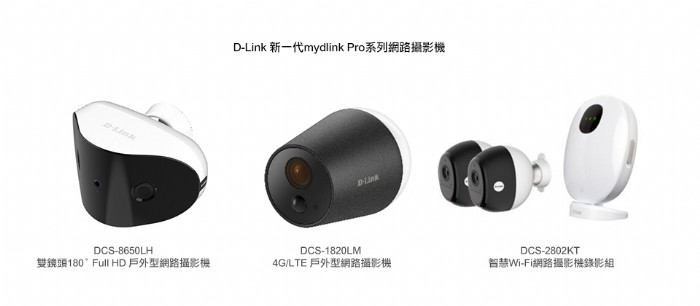 此次曝光的三款無線網路攝影機皆具備多項極致效能,包括Full-HD 1080P高解析度,智能影像分析(IVA)功能,通過IP65防水防塵認證可全天候防水,並提供雲端錄影(Cloud Recording)方案。不僅如此,每款mydlink Pro 無線網路攝影機都擁有獨特的設計亮點,使之於消費型市場裡獨樹一格。DCS-8650LH 雙鏡頭180° Full HD 戶外型網路攝影機,搭載2個超廣角鏡頭支援180度,利於完整呈現比單鏡頭更自然的錄影畫面。榮獲IF設計大獎的DCS-1820LM 4G/LTE 戶外型網路攝影機採用4G LTE 高速無線網路技術連接,且透過電池供電,設置不受限。DCS-2802KT智慧Wi-Fi網路攝影機錄影組擁有長效續航力電池適用於戶外場所。未來D-Link 將持續拓展更多mydlink Pro創新產品。