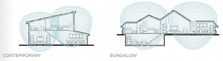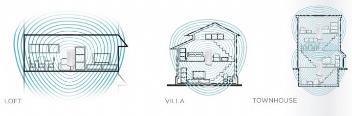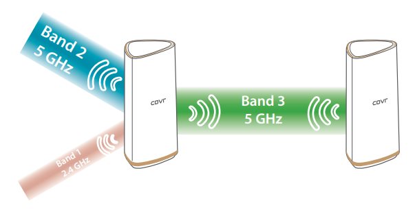 因此總頻寬為 866 * 2 + 400 = 2132Mbps (AC2200),同時也支援 802.11ac/n/g/b 各種無線網路協定。三頻網路的優點是,兩台 covr 主機用來互傳資料時可專用一個 5GHz 波段(如下圖),不會占用其他上網設備(手機、筆電等)的頻寬使用。而總涵蓋範圍也達 550平方公尺(六千平方呎/170坪)。