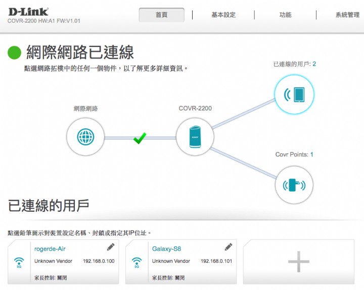 透過網頁瀏覽器或 APP 也可對 COVR-2202 進行更多的網路設定。只要在網址輸入 http://192.168.0.1 或 http://covr.local 就可進入設定頁面: