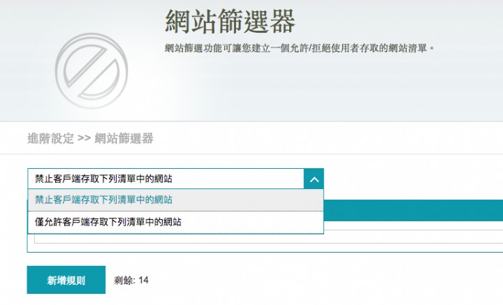 網站篩選器設定可負向表列(禁止存取清單中的網站)或正向表列(僅允須存取清單中的網站):