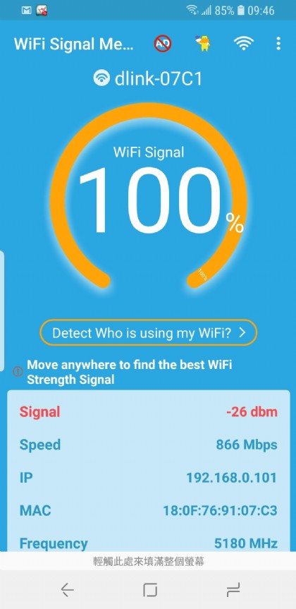 首先我們只使用單台主機,可看到在靠近主機附近訊號狀況極佳,由下圖可看到連線到 5GHz 波段,最高頻寬達 866Mbps: