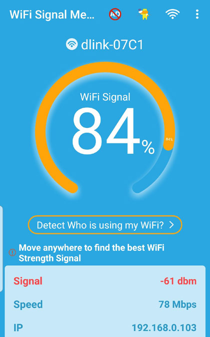 在間隔兩道牆,距離約 15m的其他房間,訊號強度降至 -61dbm,連線速率也剩 78Mbps: