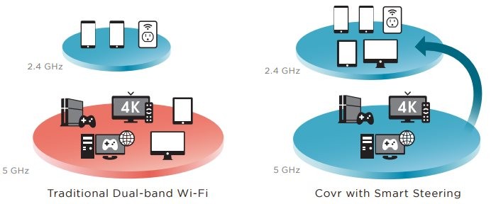 COVR-2202 也具備 Smart Steering 自動速度判斷功能。如下圖所示,傳統路由器(左)會讓用戶設備自行選擇 2.4GHz 或 5GHz 頻寬,但可能不是最佳配置方式,譬如有些頻寬需求高的設備,像是 4K 電視或是遊戲機,較適合使用 5GHz,而手持裝置或家用智慧插座等設備則只需 2.4GHz 頻寬就夠了。Smart Steering (右)會根據設備頻寬需求,自動連線到 2.4GHz 或 5GHz 波段,不需用戶再傷腦筋選擇。