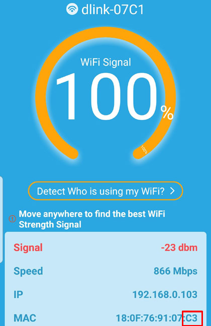 Smart Roaming 是指可根據用戶連線訊號狀況,自動選擇訊號強度連線最好的基地台主機。我們將主機與副機分開不同房間,隔兩道牆距離約 15米,首先在主機(MAC 網址最後為 C3,如下圖)附近,可看到訊號強度非常好: