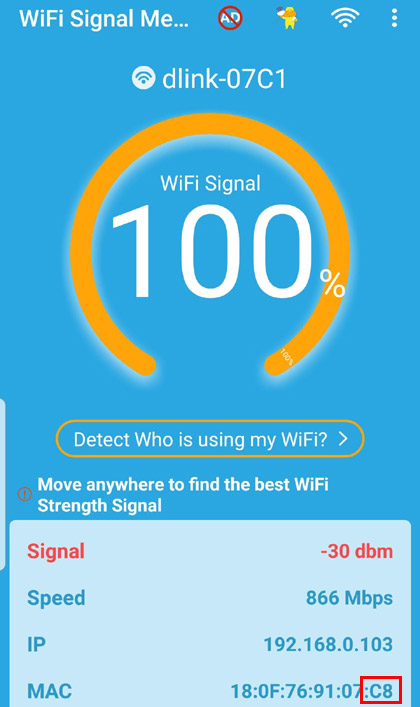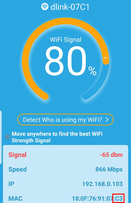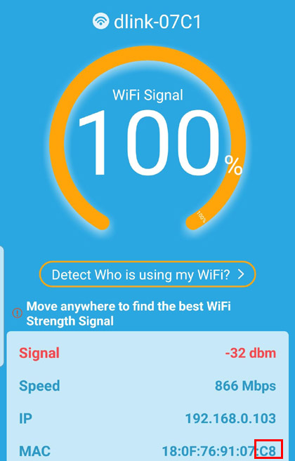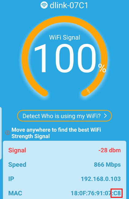當我們靠近副機時,已經可看到自動改抓副機基地台了(MAC 網址最後為 C8),訊號強度又恢復極佳狀態了: