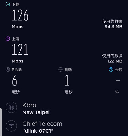 此時實測上網速度可達 全速(WAN 頻寬為 120/120Mbps):