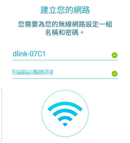 第一次使用 COVR-2202,可利用專屬 APP 的設定精靈快速完成安裝設定。利用手機連線到 dlink-07C1 這個屬於 COVR-2202 的 Wi-Fi SSID 後,便會要求重新輸入名稱與密碼: