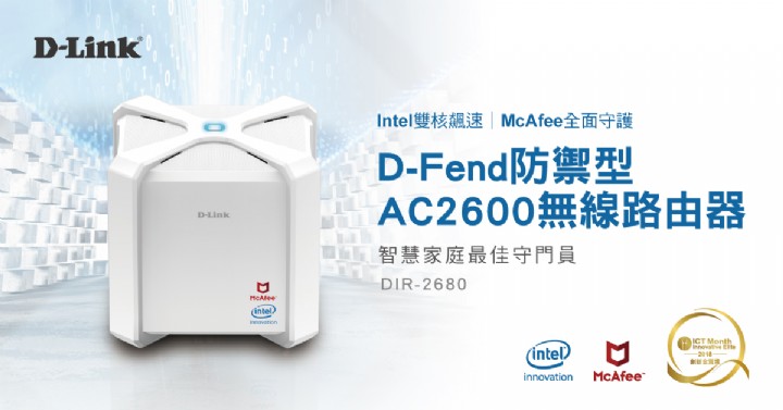 D-Link 友訊科技宣佈全新智慧家庭資安無線路由器「D-Fend防禦型AC2600路由器DIR-2680」正式在台上市,DIR-2680雙頻Gigabit 無線路由器是由D-Link策略聯盟全球防毒軟體大廠McAfee、和晶片龍頭Intel跨界三強的攜手合作,提供消費者最高網路安全規格的家用連網裝置。D-Link首款搭載IntelR GRX350 1.6GHz CPU雙核心處理器 的DIR-2680,不但提供卓越快速的無線網路傳輸效能更搭配AnyWAN? SoC晶片,透過軟體方式便能提升安全功能。