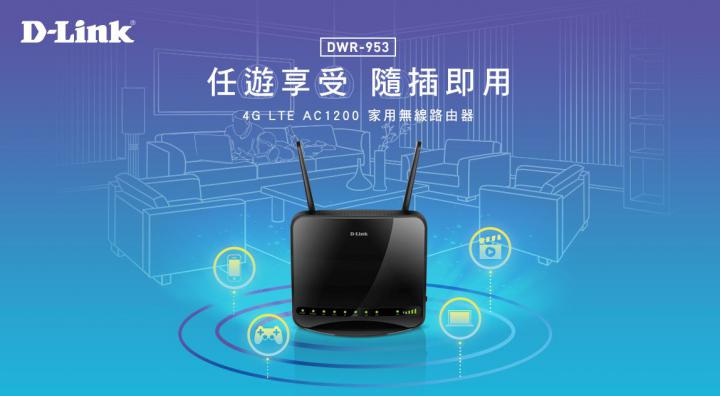 D-Link 友訊科技宣佈首款支援台灣五大電信商的家用型4G LTE AC1200無線路由器DWR-953正式在台上市。D-Link全新推出的DWR-953採用4G LTE 連網形式的路由器設計,支援LTE Cat.4和802.11ac AC 1200雙頻無線技術與四個Gigabit有線網路埠,並適用台灣五大電信業者的使用頻段,用戶只要放置一張4G LTE 網路服務的SIM卡,即可藉由4G LTE高達150Mbps下載與50Mbps上傳的網路速度上網,輕鬆便利地使用無線網路。