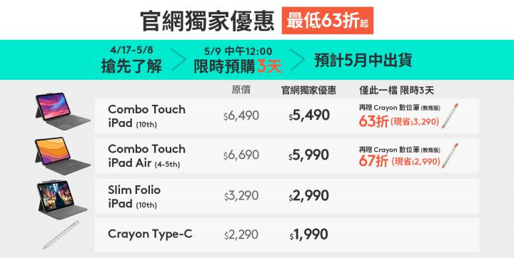 圖說:Logitech全新iPad配件系列5月9日中午12點起於官網獨家限時3天搶先預購,買指定款Combo Touch鍵盤保護套再送Crayon iPad數位筆,最低63折起。