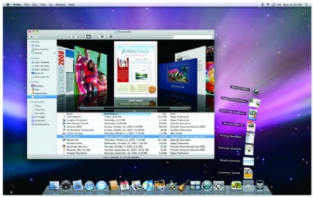 Leopard的全新桌面擁有重新設計的3D Dock及Stacks,讓使用者以全新的方式整理檔案,而且只需一個滑鼠按鍵就能快速、輕鬆地存取檔案。Leopard會自動將網頁、電子郵件及其他下載內容存放在名為Downloads的stack檔案內,以維持桌面乾淨,使用者能直接從Dock以漂亮的扇形方式展開這些檔案stack。使用者可以建立自己的stack以快速存取資料夾、文件或應用程式。Leopard令人驚豔的全新外觀也延伸到所有應用程式,桌面上所有視窗都擁有一致的設計主題,而當前使用的視窗則利用較深的陰影來凸顯。