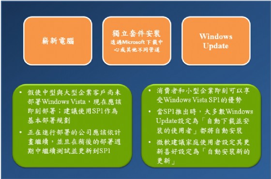 Vista SP1提供更方便的更新方式,已購買搭載 Windows Vista 電腦的使用者與小型企業用戶可透過Windows Update 來安裝Vista SP1;目前正在進行 Windows Vista 部署的中大型企業客戶,建議繼續依計畫部署當前的 Windows Vista 版本,並著手測試納入下一階段的部署作業。針對仍在規劃 Windows Vista 部署的客戶則建議採用Vista SP1當成現在部署的根基。