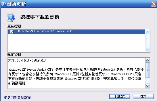 雖然歷經了 XP SP3 出槌 的窘境,不過微軟也迅速修正 SP3,不到十天立即又重新開放下載。而且如果有設定自動更新 Windows update 的話,也可看到已經半強迫要求用戶更新了: