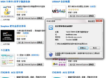將網頁中感興趣的文字反白,然後按一下所選內容上出現的藍色「加速器」圖示,即可顯示UrMap上該文字所在位置的地圖、MSN字典的翻譯與單字查詢、馬上看到露天拍賣上相關的商品訊息、將這段好文推到funP推推王上與網友分享、搜尋I’m tv豐富的影音資訊、聯合新聞網所有的即時新聞與歷史新聞資料,甚至可以瀏覽巴哈姆特上的所有相關資訊,與MSN新聞、旅遊與美食頻道的訊息。「加速器」可協助使用者快速執行日常的瀏覽工作,在原本網頁中即可快速瀏覽所需資訊。而利用Internet Explorer附加元件庫更可根據使用者的需要設定個人化自訂瀏覽器。