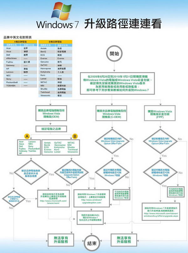 2. B種品牌電腦消費者:於前述計畫期間內購買預載有Windows Vista隨機版之特定品牌電腦(B種品牌包含:Amtek奐億、BenQ明基電通、ECS精英、Everex、Genuine捷元、GeTAC神基、Hannspree瀚斯寶麗、Kohjinsha工人舍、Kuro、Lemel聯強、MiTAC神達、MSI微星科技、Shuttle浩鑫電腦、Twinhead倫飛電腦、Viewsonic優派),且透過Windows Vista包裝取得「Windows 7升級選項」之品牌電腦的消費者。想要升級至Windows 7須按「Windows 7升級選項」所載,到微軟升級網站(http://windows7upgradeoption.com)完成相關線上升級程序,即可取得Windows 7升級版本使用權。所有相關升級條件與條款(包括應支付的費用),均由各品牌電腦廠商決定。