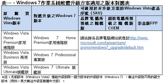 為了讓有更換新機需求的消費者能夠放心添購所需的電腦,立即體驗Windows Vista的強大效能,並且未來可輕易升級到Windows 7,台灣微軟公司今(二十六)日推出Windows 7作業系統軟體升級方案,消費者只要在2009年6月26日至2010年1月31日期間,購買預載Windows Vista Home Premium家用進階版、Windows Vista Business商用版和Windows Vista Ultimate旗艦版之特定品牌電腦、組裝電腦或彩盒包裝版的消費者,皆可在Windows 7上市之後,將Windows Vista升級到相對應的Windows 7版本。