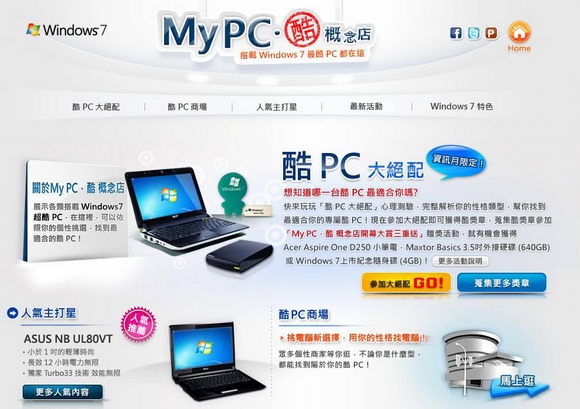 要如何尋找搭載Windows 7、專屬於你個人的酷PC呢?微軟Windows 7資訊月形象館網路加碼版,立刻上「My PC.酷」線上概念店,可以找到最多最豐富搭載Windows 7的酷PC,即日起至資訊月期間,上網參加「My PC.酷」概念店開幕三重送活動,就有機會把超酷的Acer小筆電、外接式硬碟、Windows 7上市紀念隨身碟或限量獨家好禮帶回家。