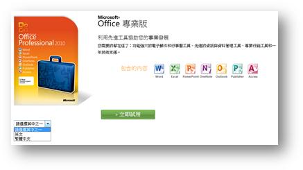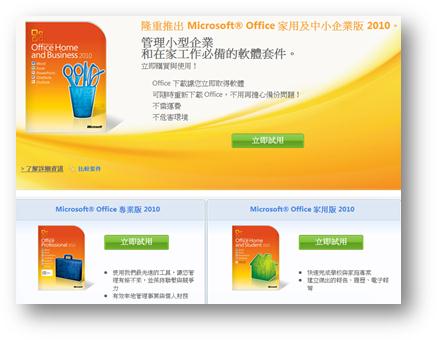 微軟自六月初展開Office 2010零售版本預購活動後,獲得廣大迴響;為了讓消費者搶先在7月9日產品正式上架前體驗Office 2010的創新功能,台灣微軟即日起開放Office 2010繁體中文版下載試用,消費者可至Office網站 (http://www.tryoffice2010.tw) 立即下載60天試用版。