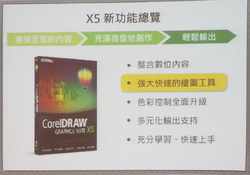 Corel 今日推出屢獲獎項肯定的專業繪圖應用軟體CorelDRAW Graphics Suite X5。最新版本CorelDRAW Graphics Suite X5中有超過五十種新功能及增強功能,包括資產管理、色彩管理、Web圖形方面的重大增強功能,以及各式各樣的學習資源和前所未見的豐富內容。記者會現場邀請到遠從加拿大而來的CorelDRAW產品總監John Falsetto做新版本產品示範,並與台灣新生代設計師Marscat和擁有跨國設計團隊的Coplay營運長Vic一同暢談CorelDRAW如何讓設計成為國際語言進而累積財富!