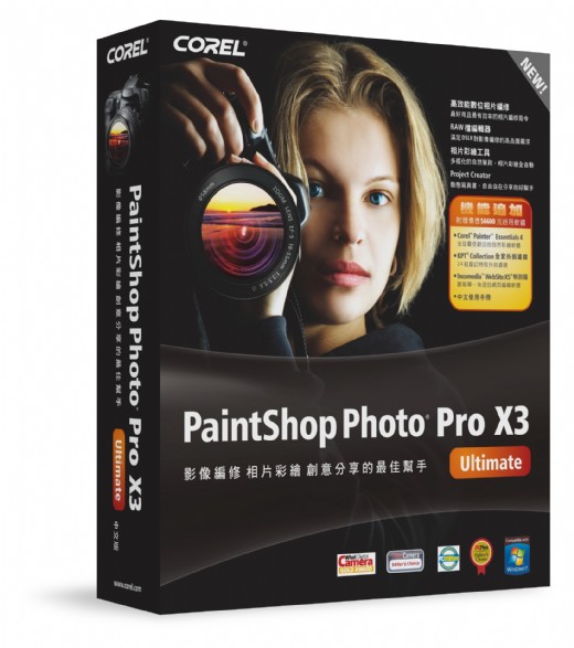 · Corel PaintShop Photo Pro X3:最近推出的 X3.2 更新版本,在效能及穩定性上均有所提升,Corel PaintShop Photo Pro X3 以此為基礎,進一步結合專業品質組織和相片編輯工具,以及相片專案、備份和高畫質 (HD) 視訊電子相簿功能,可因應攝影師當前不斷改變的需求。全新的工具包括媒體管理及 Project Creator,以及智慧型雕刻器、Camera RAW 編輯器、物件擷取工具等的動態編輯功能。