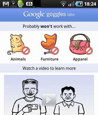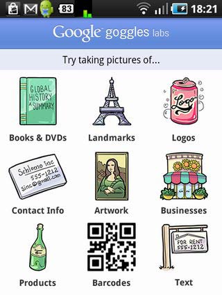 我們的標題沒打錯!第二個單字 "goggles" 是 Google 的一個強大的影像辨識與搜尋程式,只要利用手機拍攝商品的條碼、書籍唱片封面、或是藝術品圖像等等,"goggles" 便會自動辨識並搜尋出這些相關的商品。甚至,只要往某個風景或街上的建築物拍張照片,不需透過 GPS 也能幫你找出到底在什麼位置。goggles 也能當成名片掃描器將名片的電話姓名資料加入聯絡人中。