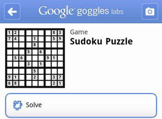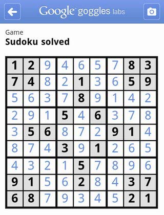 現在 Google 推出 goggles 1.3 版,除了改進了一些功能外,還增加了一個人工智慧解答數獨的功能,只要往報紙雜誌或螢幕上的數獨方塊照張相,便會立即透過雲端智慧,將數獨的空格填滿!