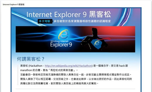 微軟IE9黑客松活動將於3月12日,在台灣微軟台北辦公室舉行,只要從網路上報名並經過專人審核後,熱情優秀的程式開發人員就有機會展現你無限的創意並獲得優渥的獎品。資格審核測驗項目分成選擇題及申論題兩個部份,前半部以測試參賽者對IE9瀏覽器相容性議題的了解與認知程度、及繪圖軟體的執行應用基本概念;後半部份則是讓參賽者利用IE9為平台,配合其它支援軟體來做創意的展現。