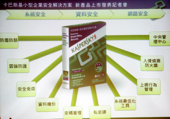 卡巴斯基亞太區董事總經理張立申強調:「卡巴斯基小型企業安全解決方案是專為中小企業量身設計的新產品,它具備方便管理和功能完備的優點,結合強大的防毒、防駭功能,能維護資料安全,並能監控上網行為,將電腦設備和網路通通納入安全防護網裡,這款新產品將為沒有IT專家的小型企業提供經濟實惠的資安防護功能。」