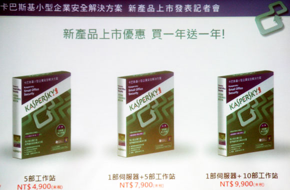 卡巴斯基小型企業安全解決方案將於六月在台上市,共推出三種產品規格,用以保護五台PC、或五台PC外加一台伺服器,在台售價分別為NT$5,145和NT$8,295,另有保護十台PC加一台伺服器,售價為NT$10,395,比目前市面上其他有伺服器保護的資安產品優惠許多。湛揚科技為了讓中小企業輕鬆享有卡巴斯基小型企業安全解決方案,即日起特別為台灣企業客戶推出買一年再送一年的優惠方案,用一年的價格,享有兩年的授權。卡巴斯基小型企業安全解決方案今年八月將於3C通路上市,預計將掀起一陣熱銷風潮。