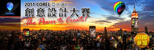 2011COREL亞太區創意大賽將從2011年9月1日開始到12月31日止,邀請台灣、香港、中國大陸、韓國、日本、紐澳、印度、新加坡等亞太地區的數位藝術創作好手報名參加。此次大賽的總冠軍將可獨得價值超過新台幣三十萬元的獎項,包括獎金5,000美元、蘋果MacBook Pro電腦乙台、Genius G-Shot HD 1080T數位攝影機乙台、Wacom Intuos4 數位繪圖板、Corel繪圖及數位多媒體剪輯軟體系列及Corel頒發的創意設計大賽得獎證書。此次活動有許多著名的合作廠商包含:Genius、Wacom、巨匠電腦、聯成電腦、學承電腦、甲尚科技、中華設計師協會、台北市漫畫家職業工會、國際藝術公益協會、Arttime藝術網和ㄇㄞˋ點子靈感創意誌等共襄盛舉宣傳並贊助獎項。