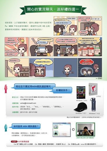 為因應消費者熱烈反應,台灣微軟宣布,「Windows 諮詢站」將於年底從100家擴增至150家,協助全台消費者在Windows 7上打造最個人化的免費雲端應用,提供完善的Windows 雲端生活體驗。同時,為歡慶Windows 諮詢站全台擴張據點,凡於本周起連續兩個周末(11/12~11/13與11/19~11/20) 至全台任一家Windows 諮詢站體驗Windows全新免費軟體 (Windows Live影像中心、Movie Maker、Internet Explorer 9),立即贈送限量好禮三選一;此外,上Facebook打卡諮詢站店家名稱、或使用Windows Live Messenger視訊通話功能並拍照,還可獲得加碼好康贈品。